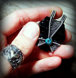 A beautiful tourmaline, wrapped specially for me!...( and the thumb ring looks famliar too! :)
